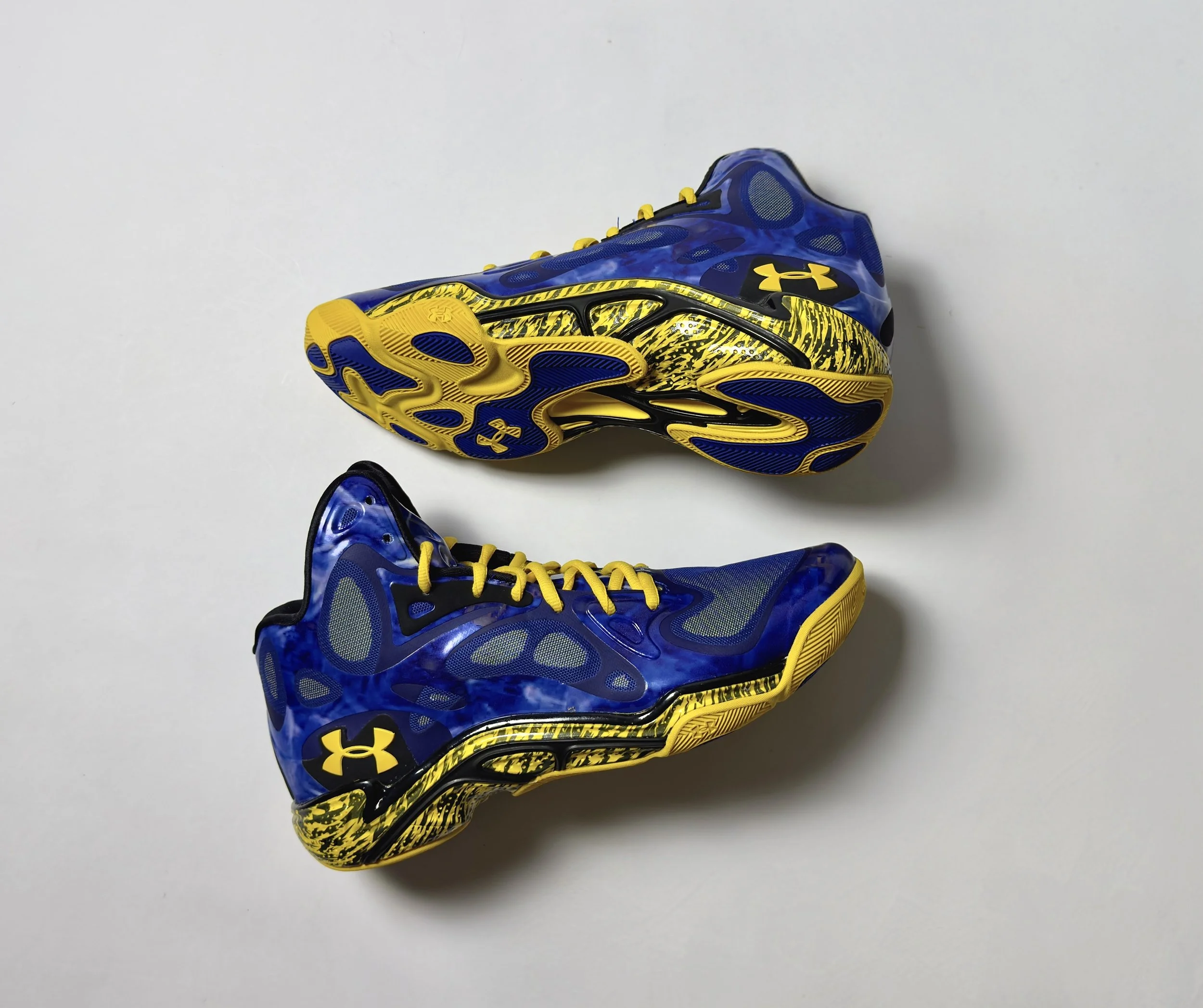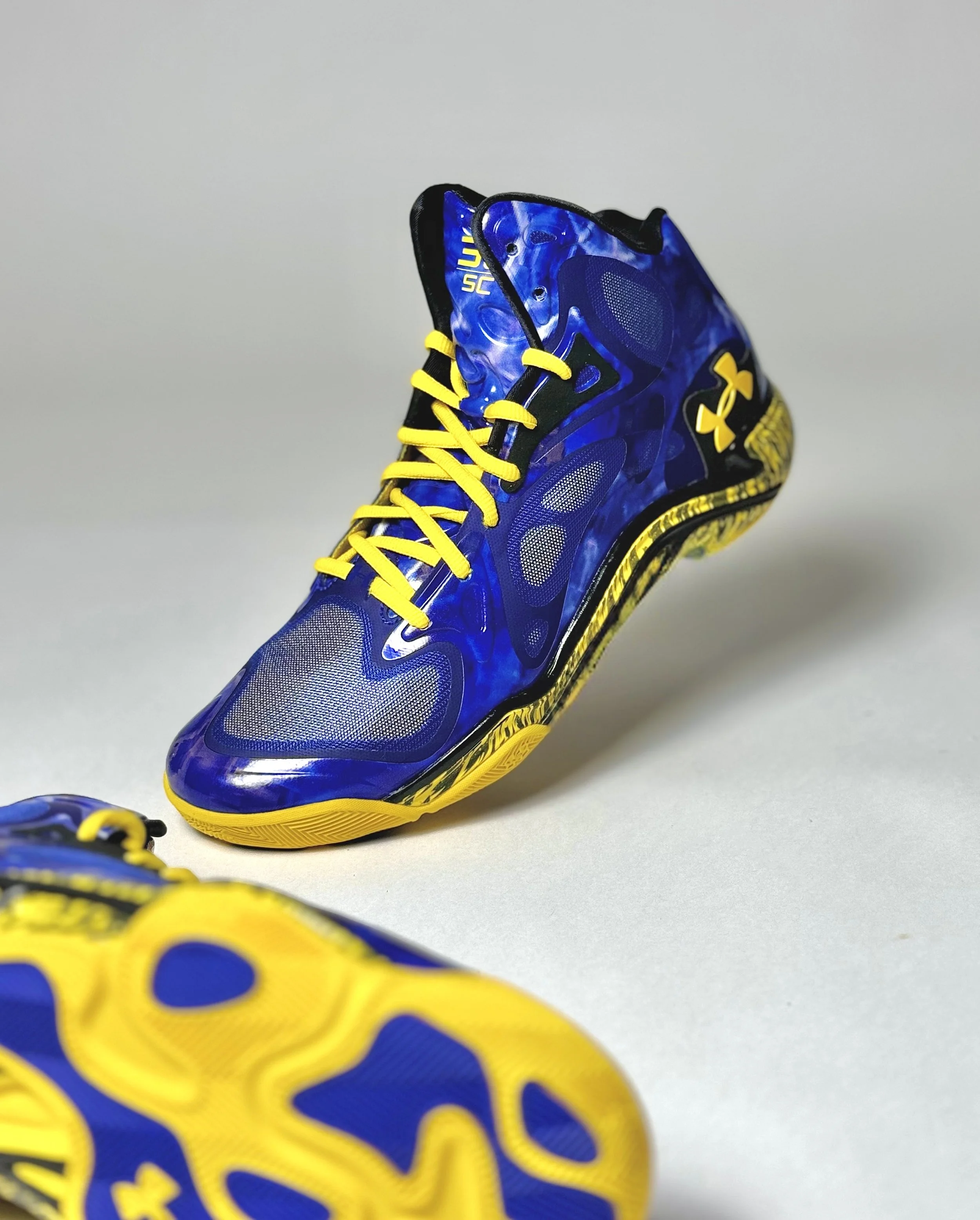 The Anatomix Spawn was Under Armour’s flagship basketball model in 2014, worn by several of its top athletes, including Brandon Jennings and Kemba Walker, each showcasing their own Player Exclusives (PEs) throughout the season. Among the most notable releases was the ‘Blue Splash’ colorway, designed to reflect the Golden State Warriors’ team colors. The shoe featured a blue upper with a water-swirl pattern on its synthetic material, complemented by contrasting yellow accents on the laces and outsole.