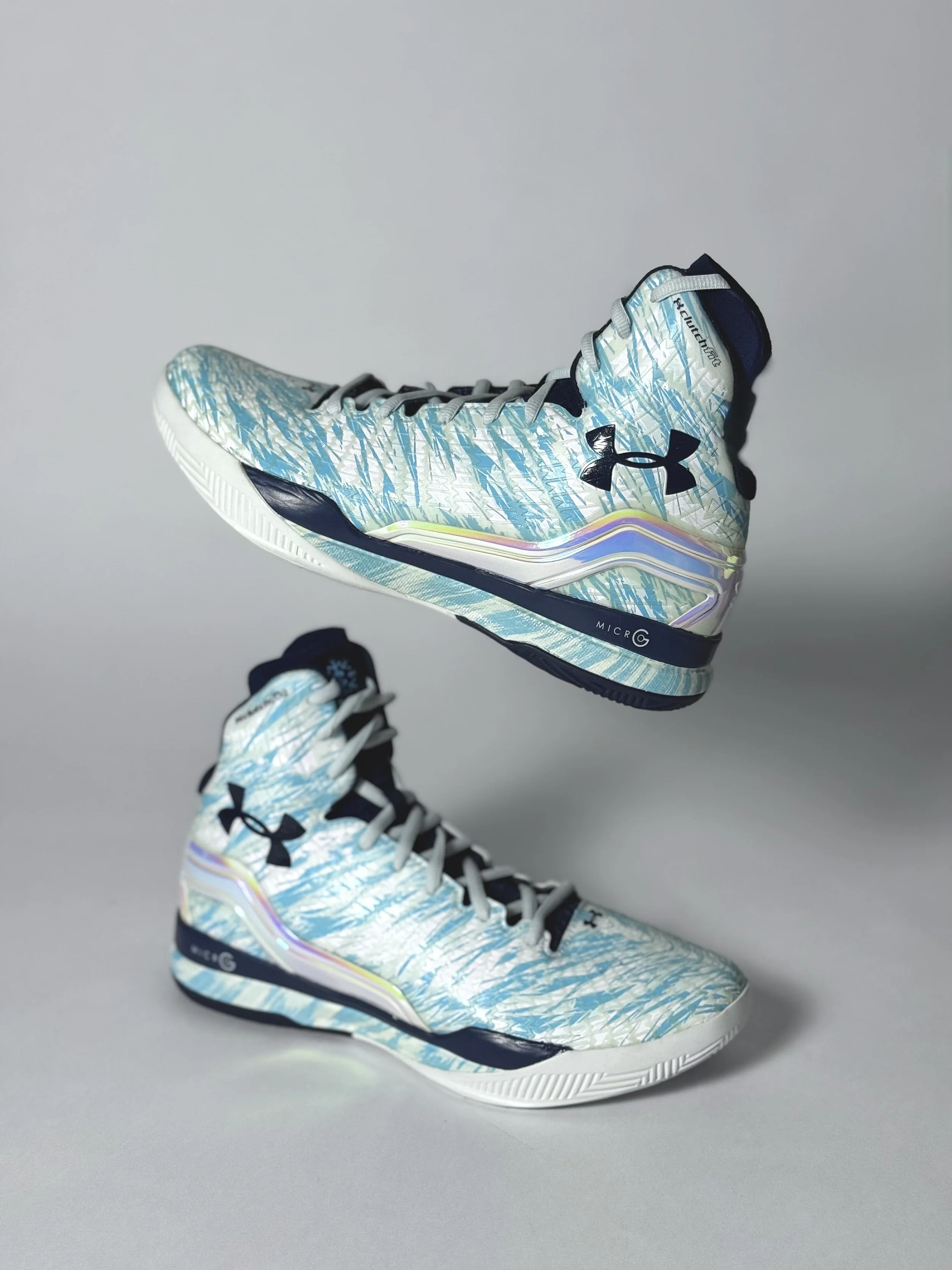 On Christmas Day, December 25, 2014, Stephen Curry took the court in a special Player Exclusive (PE) edition of the Under Armour Clutchfit Drive, appropriately nicknamed the “Blizzard.” Designed specifically for the NBA’s annual holiday showcase, this winter-inspired colorway reflected both the season’s festive spirit and Curry’s reputation for delivering ice-cold performances under pressure.
