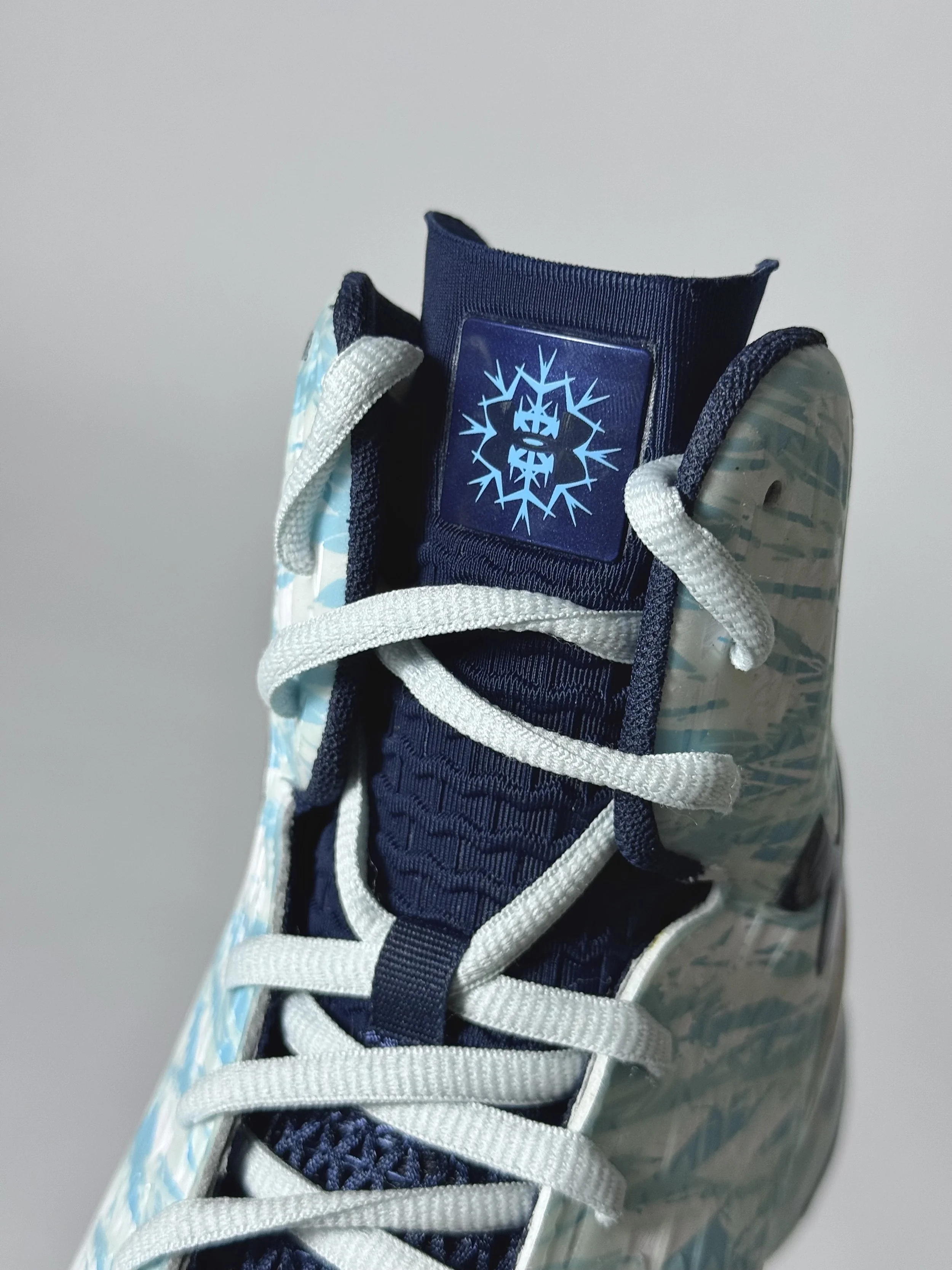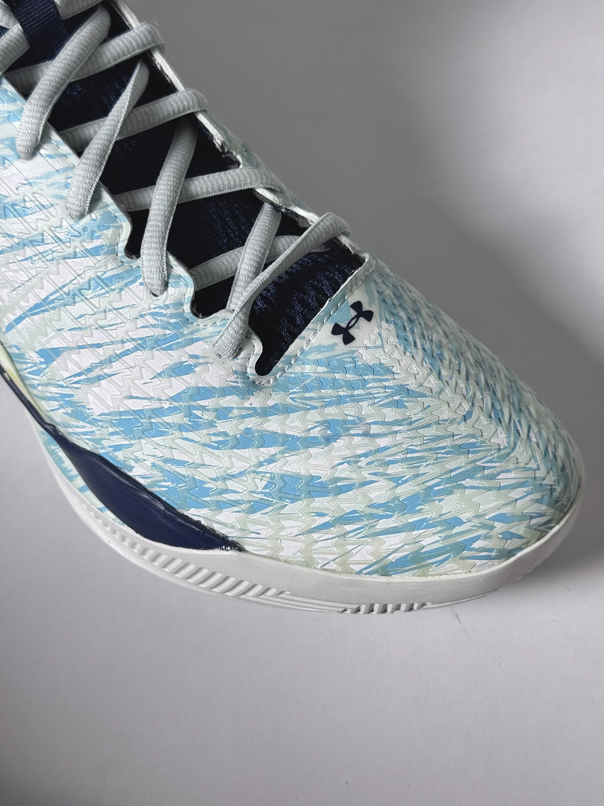 The ‘Blizzard’ edition of the Clutchfit Drive is defined by a crisp white base, overlaid with a snowstorm-inspired graphic pattern that sweeps across the upper, evoking the swirling motion of winter winds. A deep, frosty blue accents the tongue, inner lining, Under Armour branding, and midsole, reinforcing the icy aesthetic. The external heel cup is finished in an iridescent, ice-like sheen, enhancing the shoe’s frosty visual appeal while subtly nodding to Curry’s cold-blooded playmaking ability. Together, these elements make the ‘Blizzard’ not only a festive holiday PE but also a standout moment in the early years of Curry’s partnership with Under Armour.