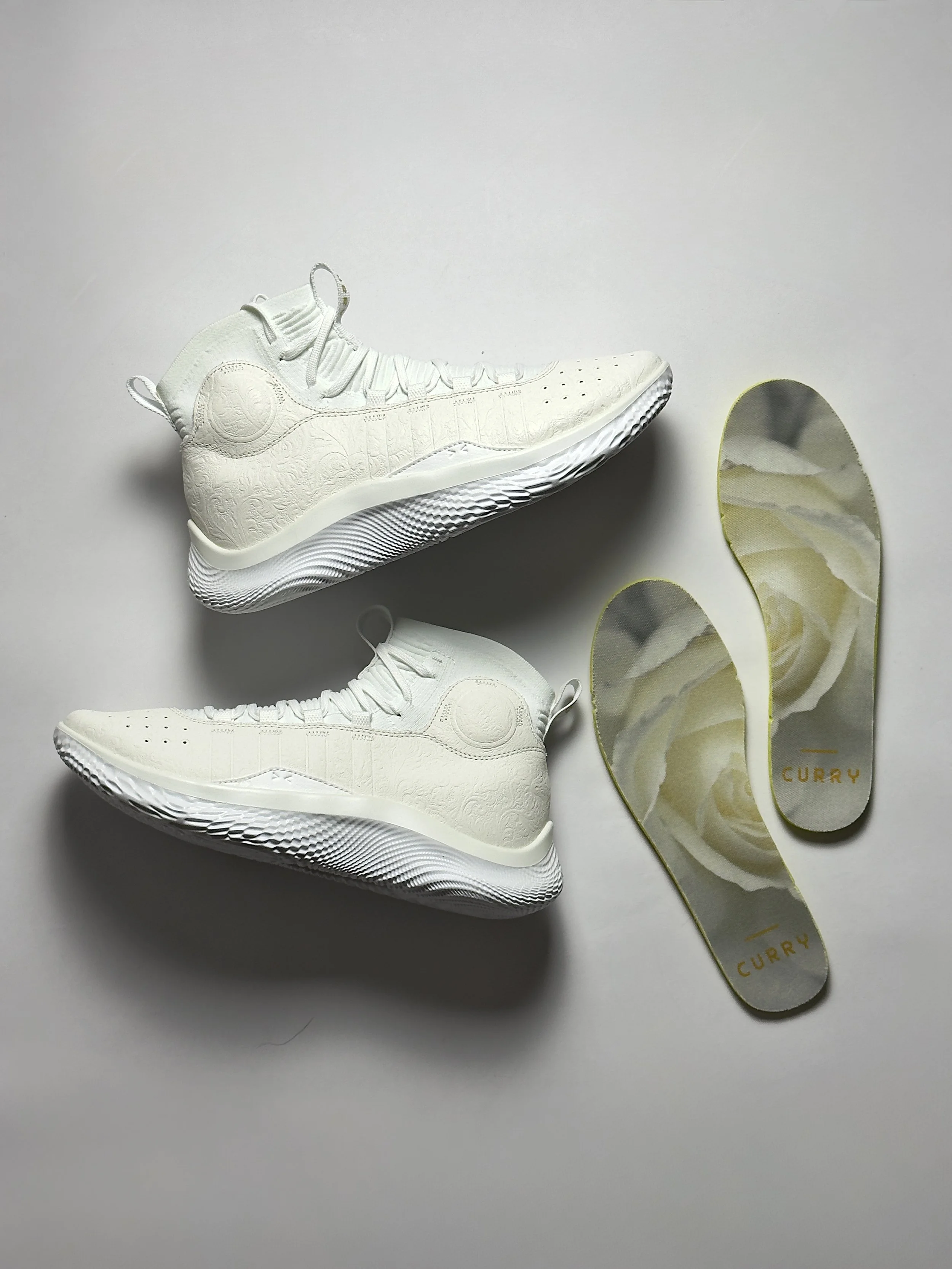 Originally designed as a Player Exclusive, the Curry 4 Flotro “Roses” celebrates Stephen Curry and those who have supported his journey—symbolically “giving them their flowers.” The shoe features a pristine all-white colorway, constructed with a full-grain leather upper embossed with an elegant floral pattern throughout.