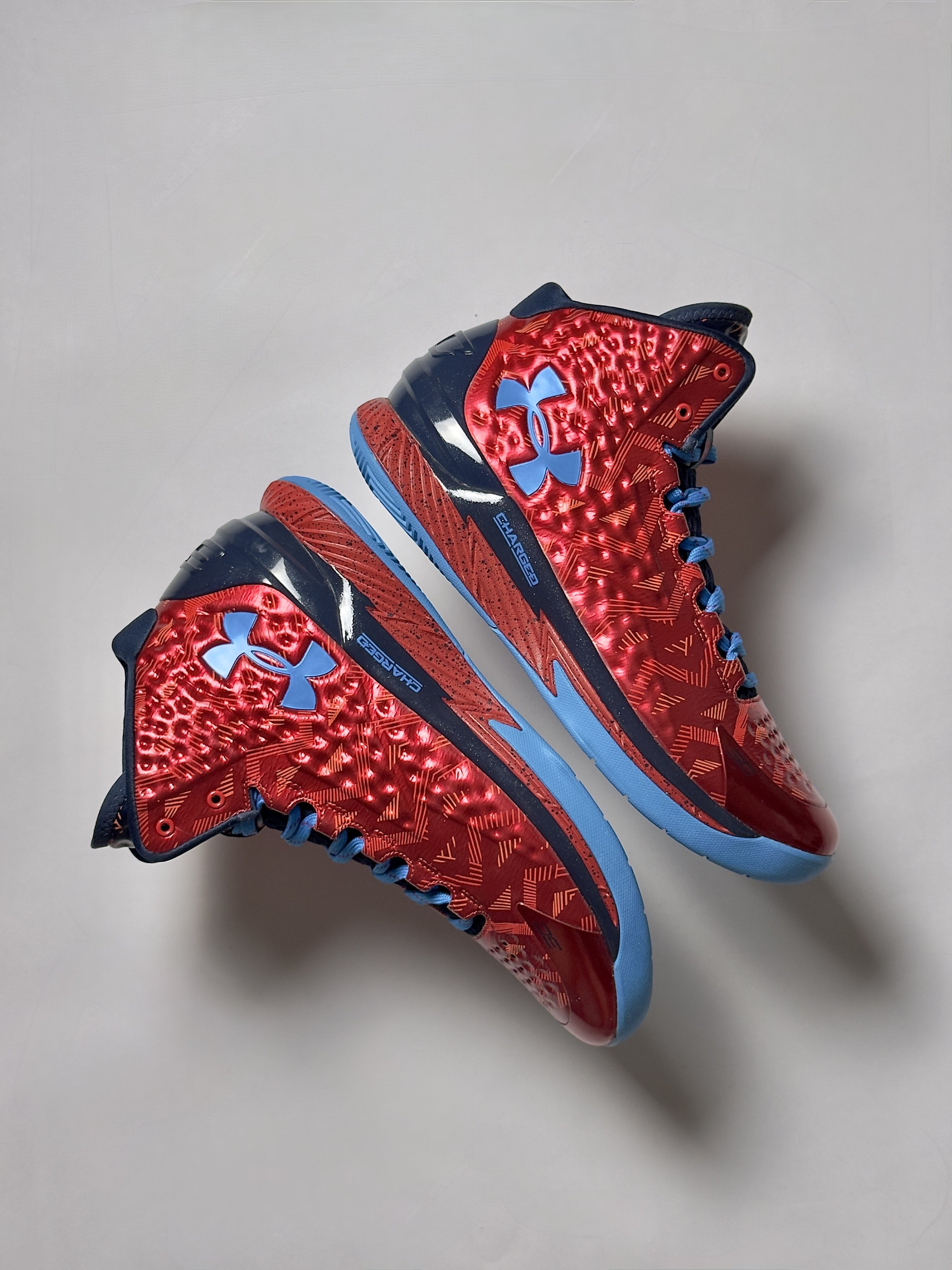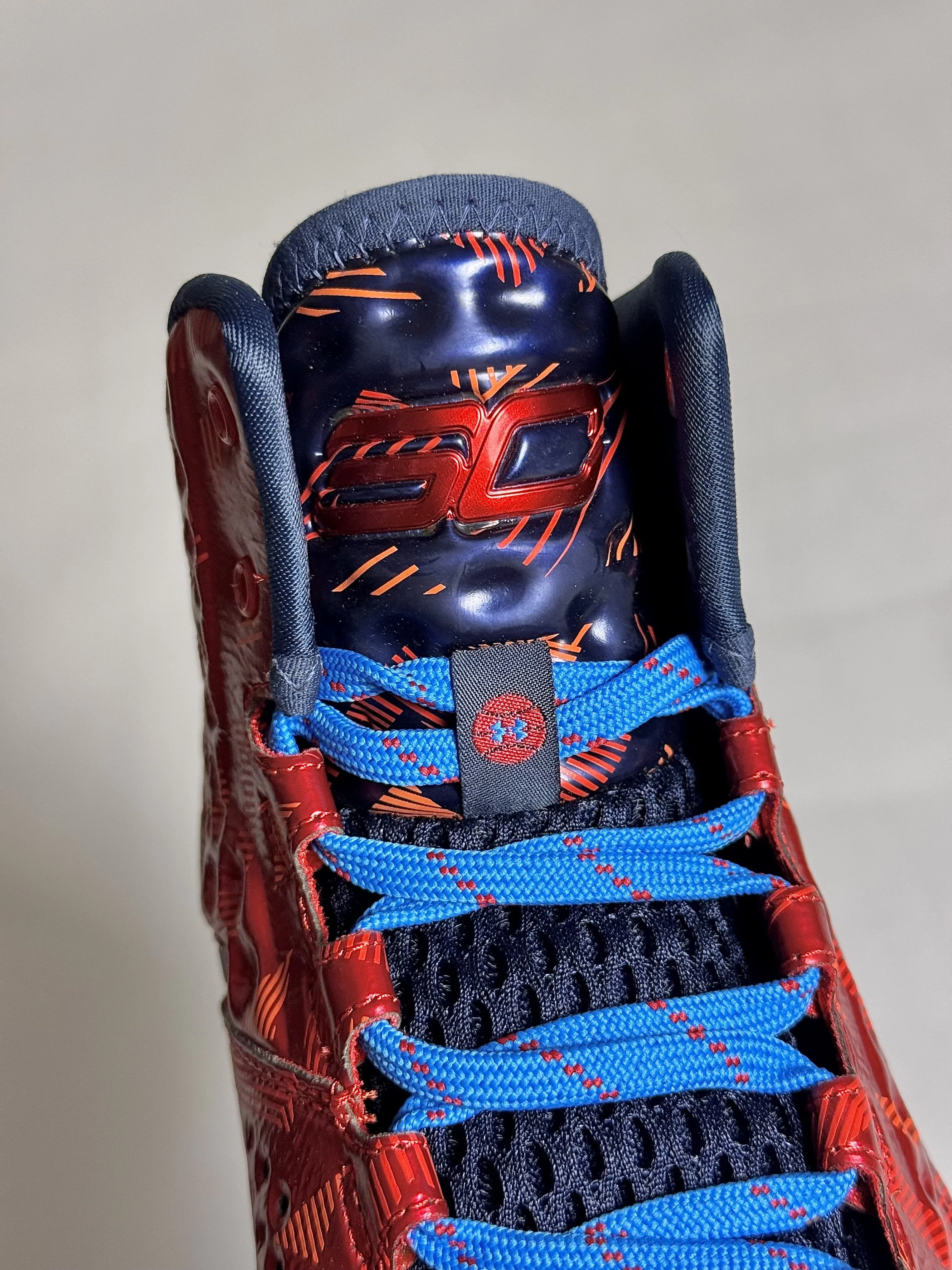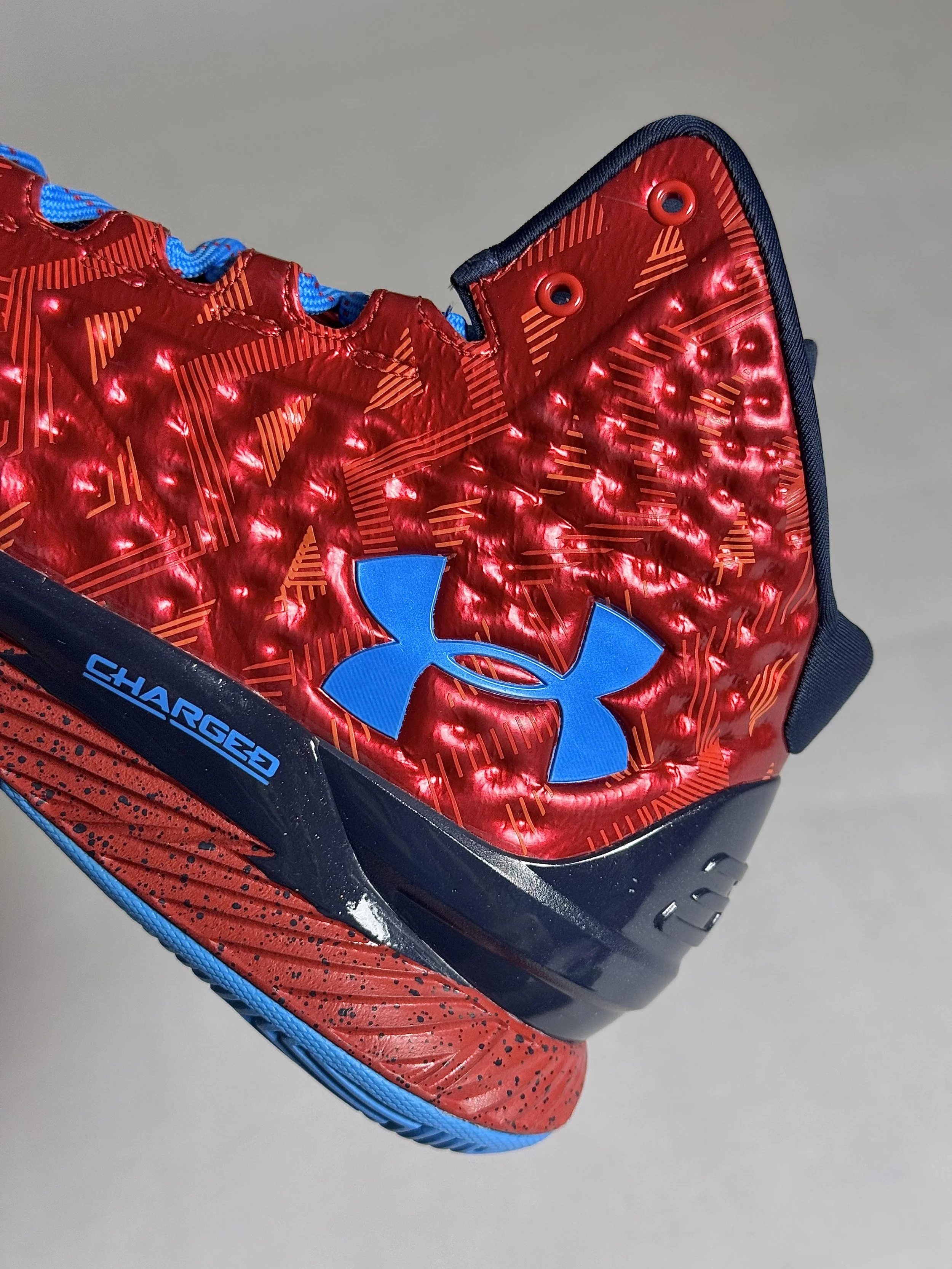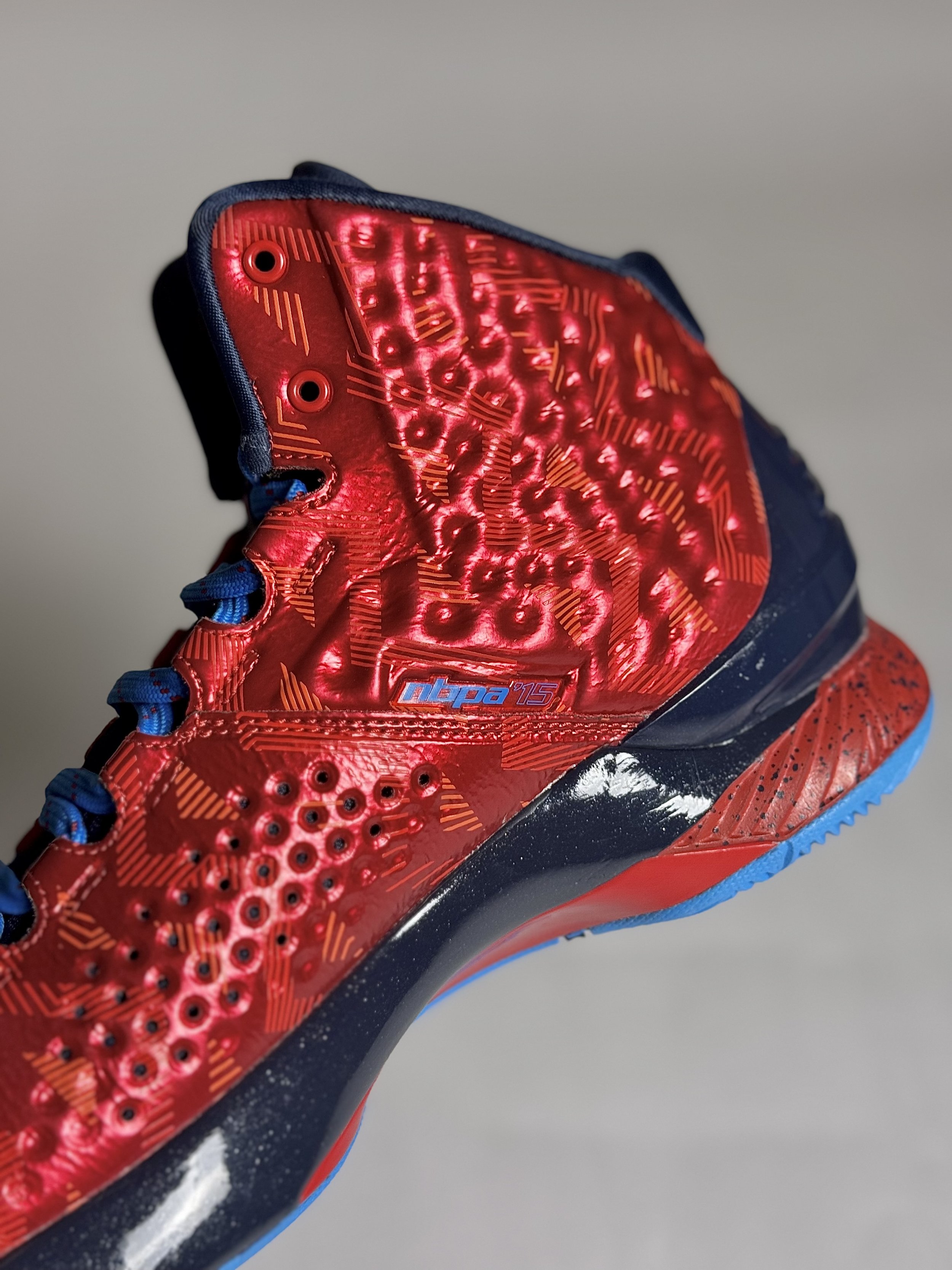 This special-edition Curry One features a predominantly glossy red upper, complemented by navy accents on the midsole, tongue, and liner. A lighter blue highlights the laces, outsole, and UA branding, adding contrast to the design. Custom event-specific details include a commemorative logo on the ghillie loop and “NBPA ’15” stamped on the medial side.