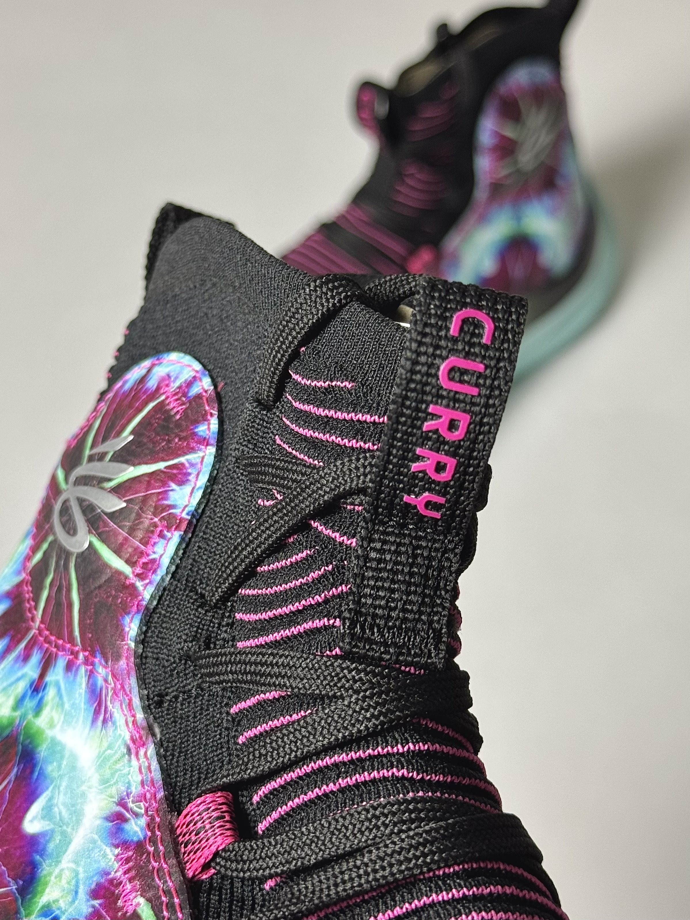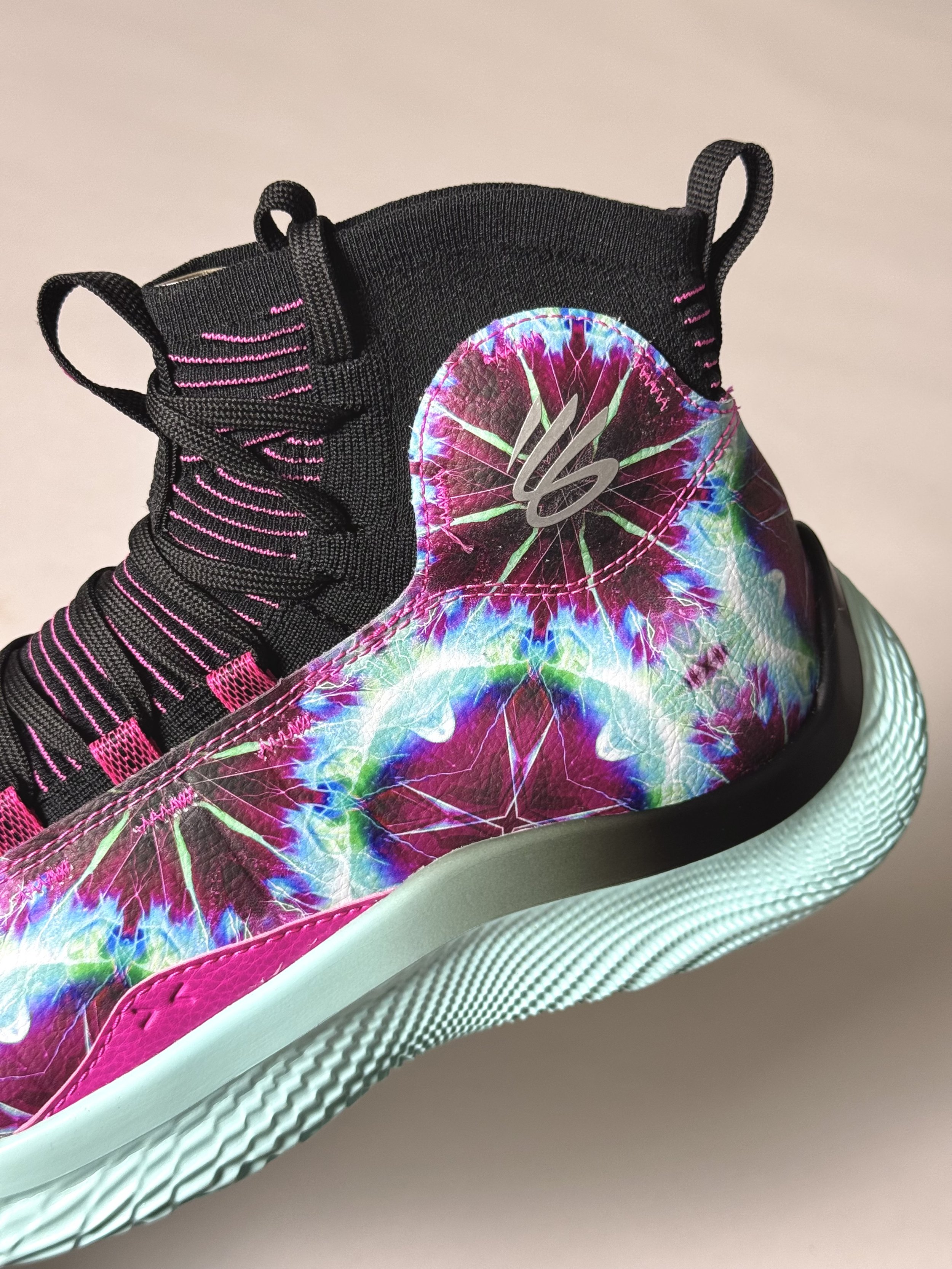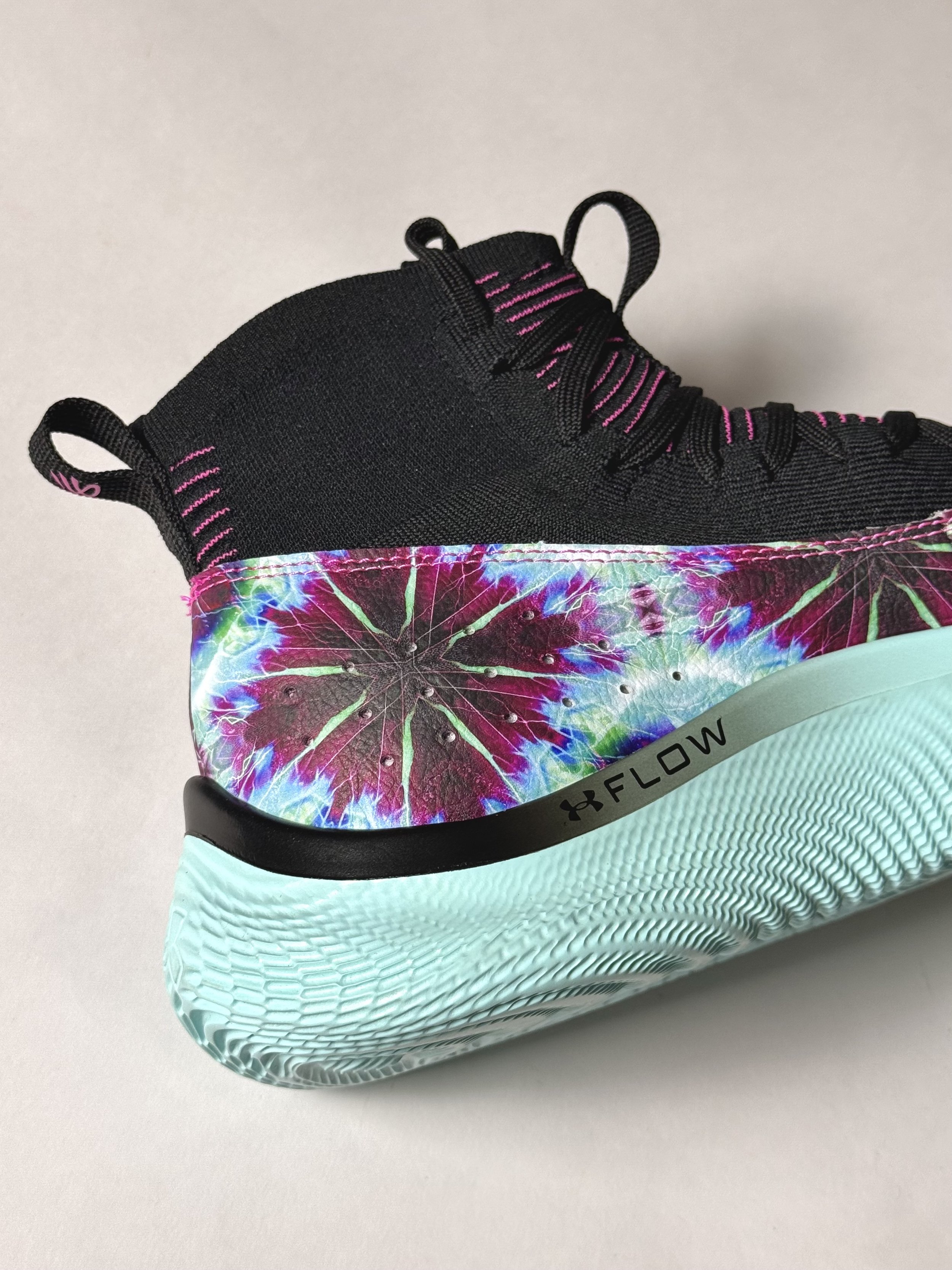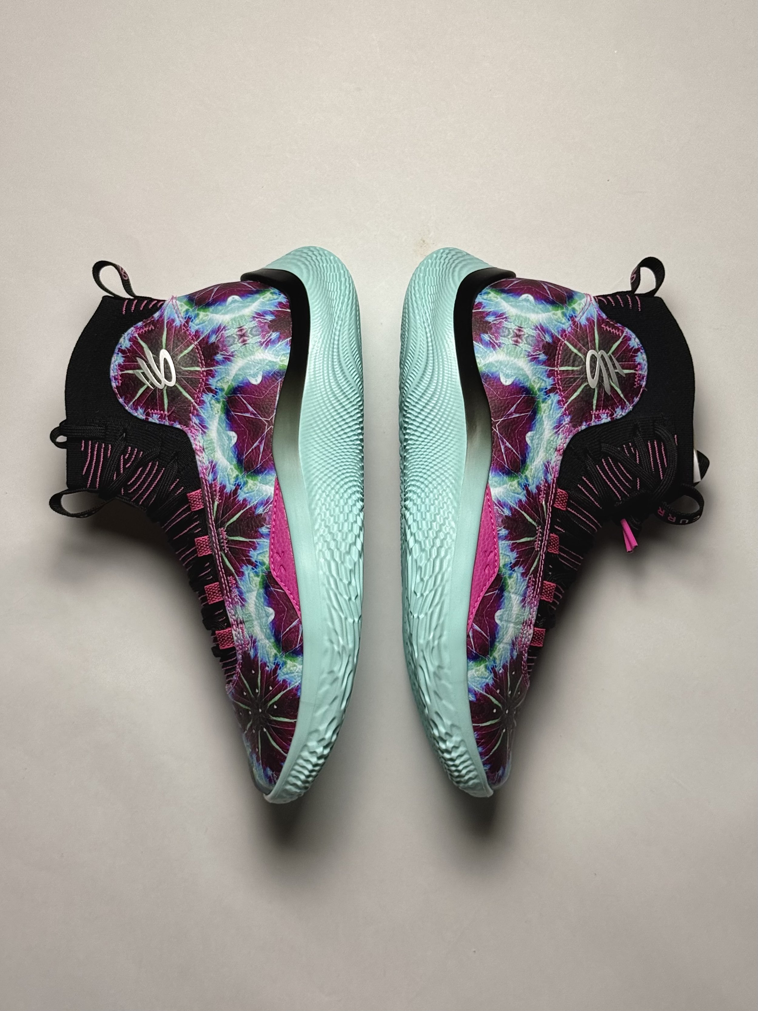 Originally designed as a Player Exclusive, the Curry 4 Flotro “Karaoke/Wardell Mode” celebrates Stephen Curry’s love for Karaoke. The vibrant colors of a mint blue and hits of black and purple are done in tie-die pattern throughout the upper.