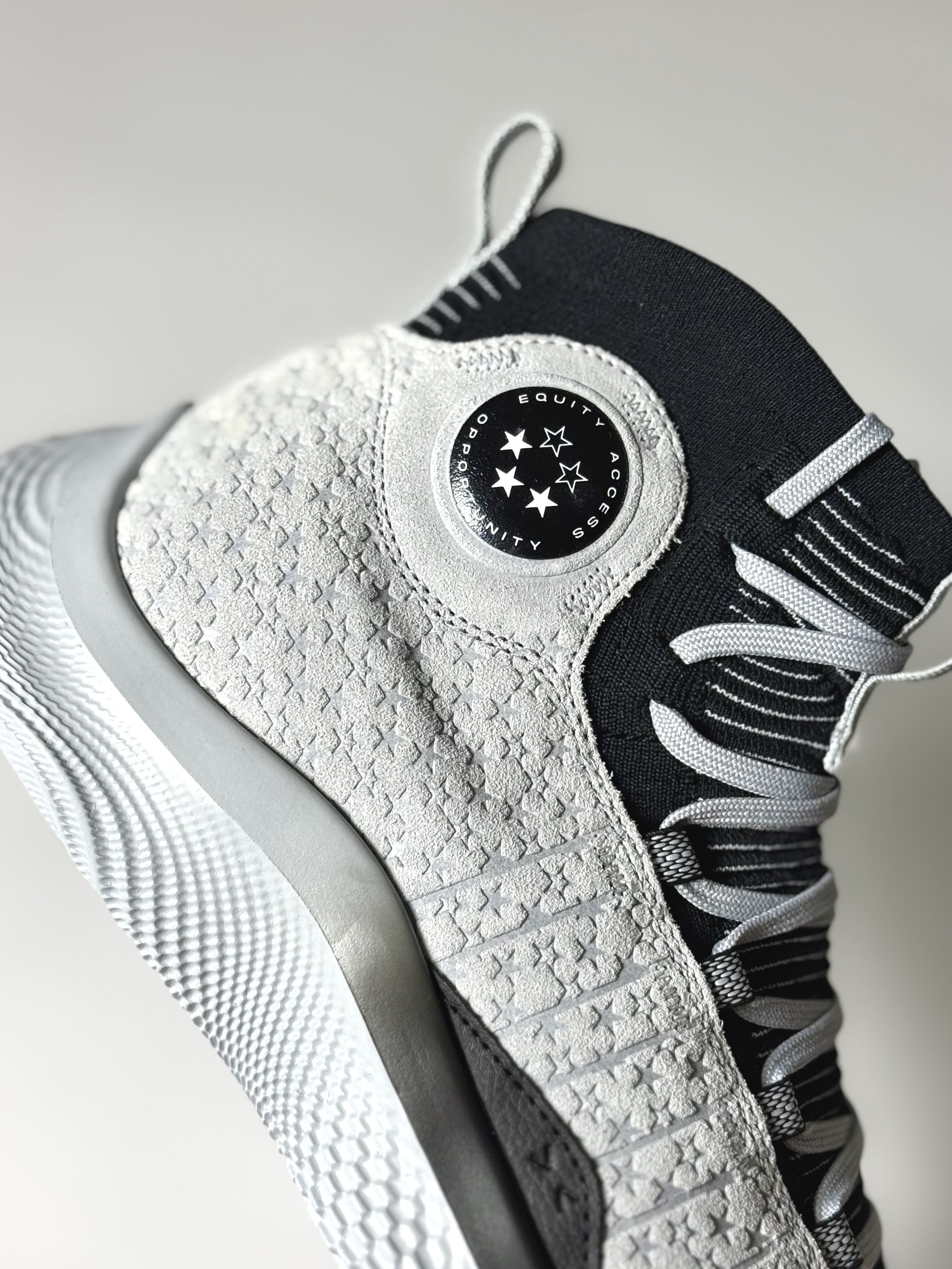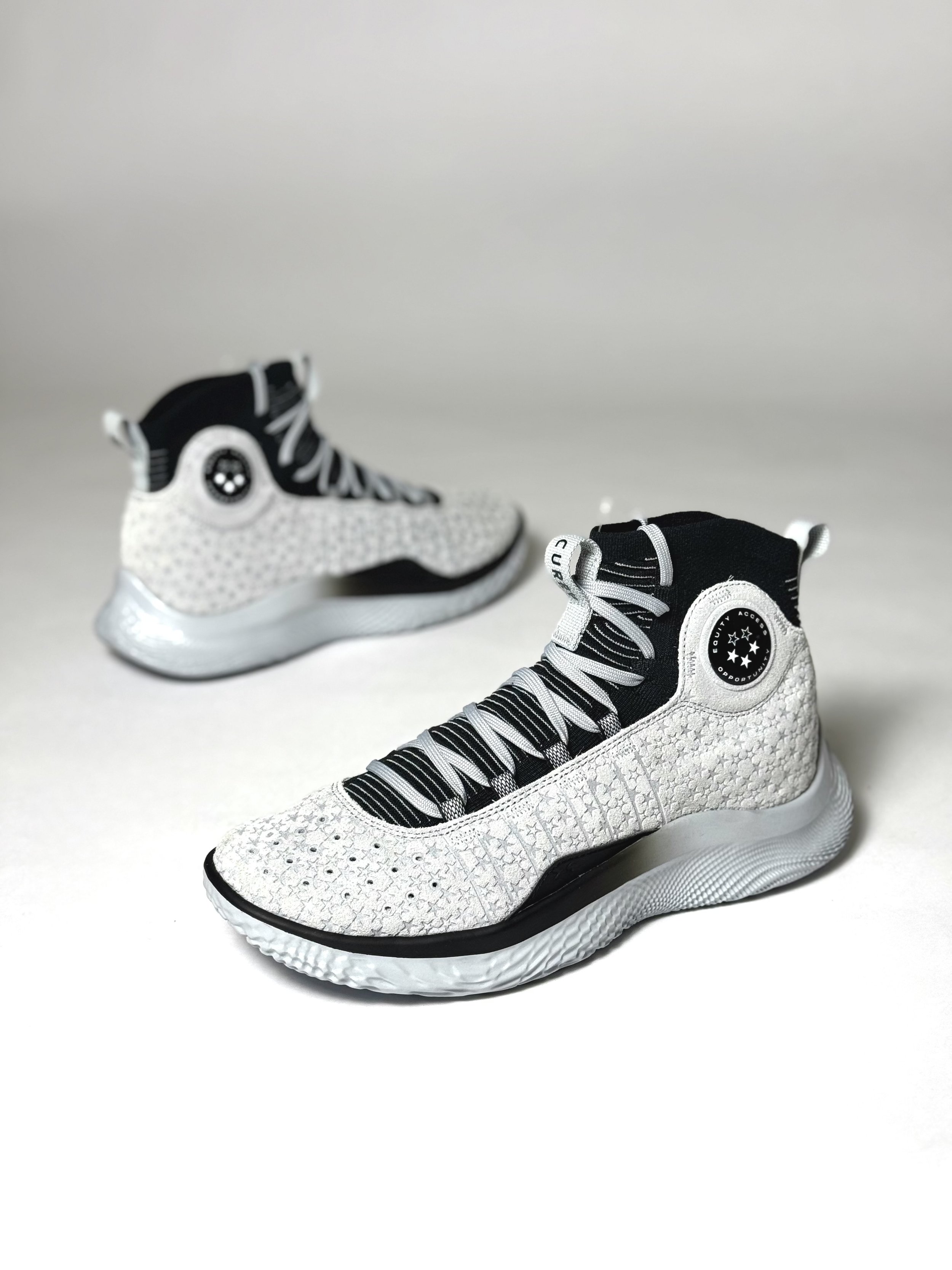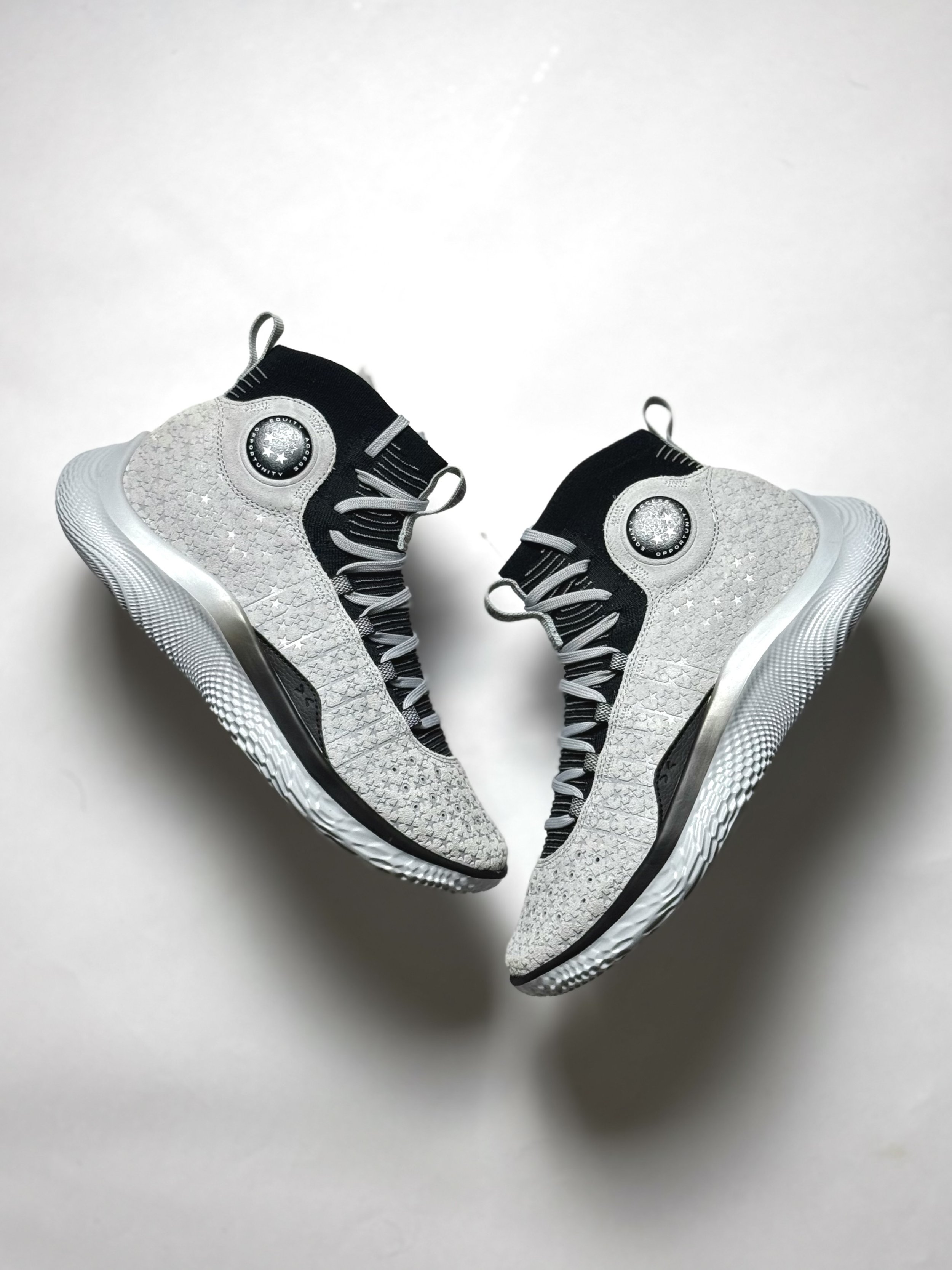 This special PE is dressed in a grey base with black accents throughout the sock liner, tongue lining, and midsole. The most distinctive design elements appear on the upper, where grey nubuck is embossed with a repeating three-star pattern—a direct nod to Curry’s early recruiting evaluations. The Underrated logo is prominently featured at the ankle, reinforcing the shoe’s central theme.