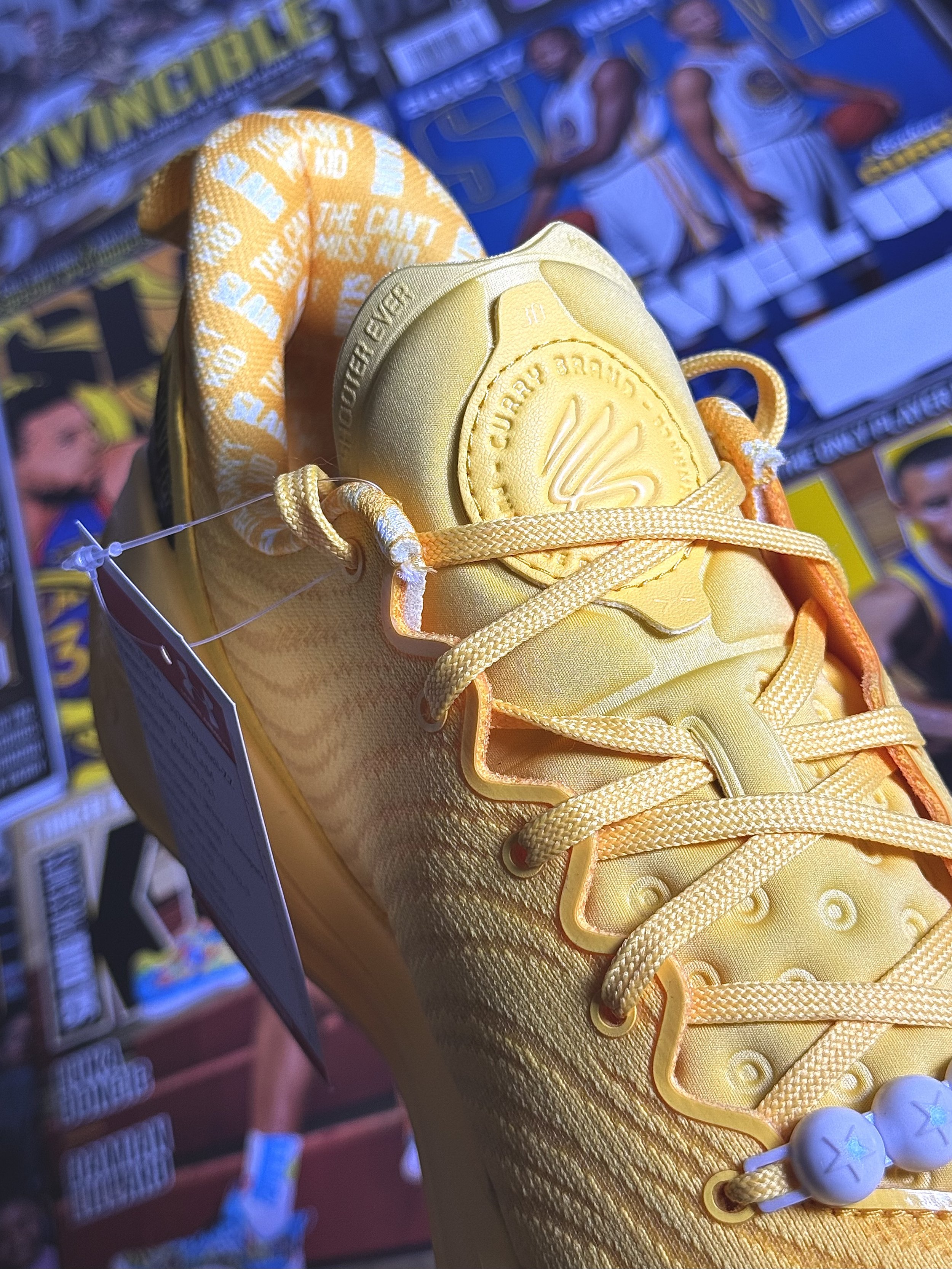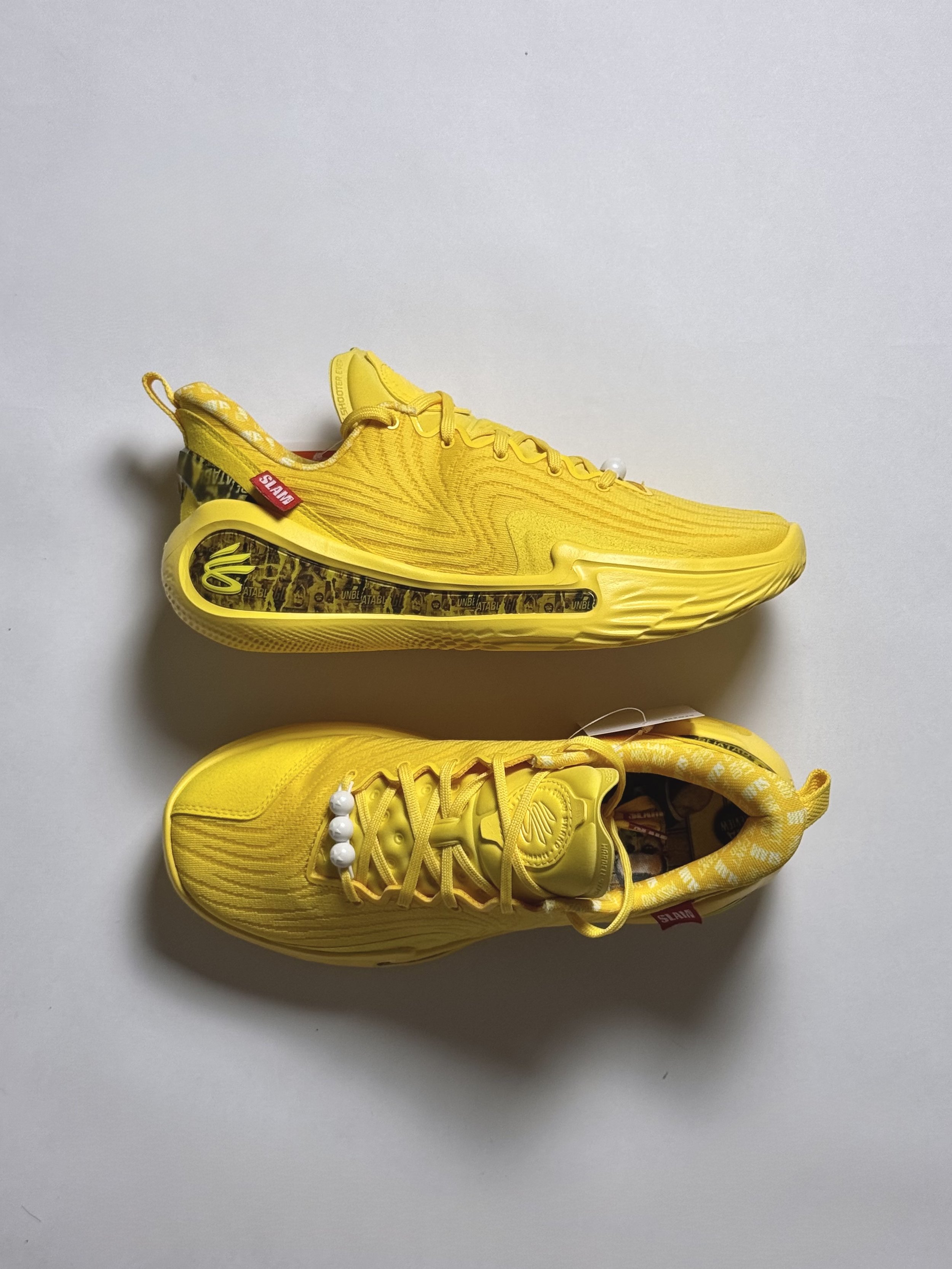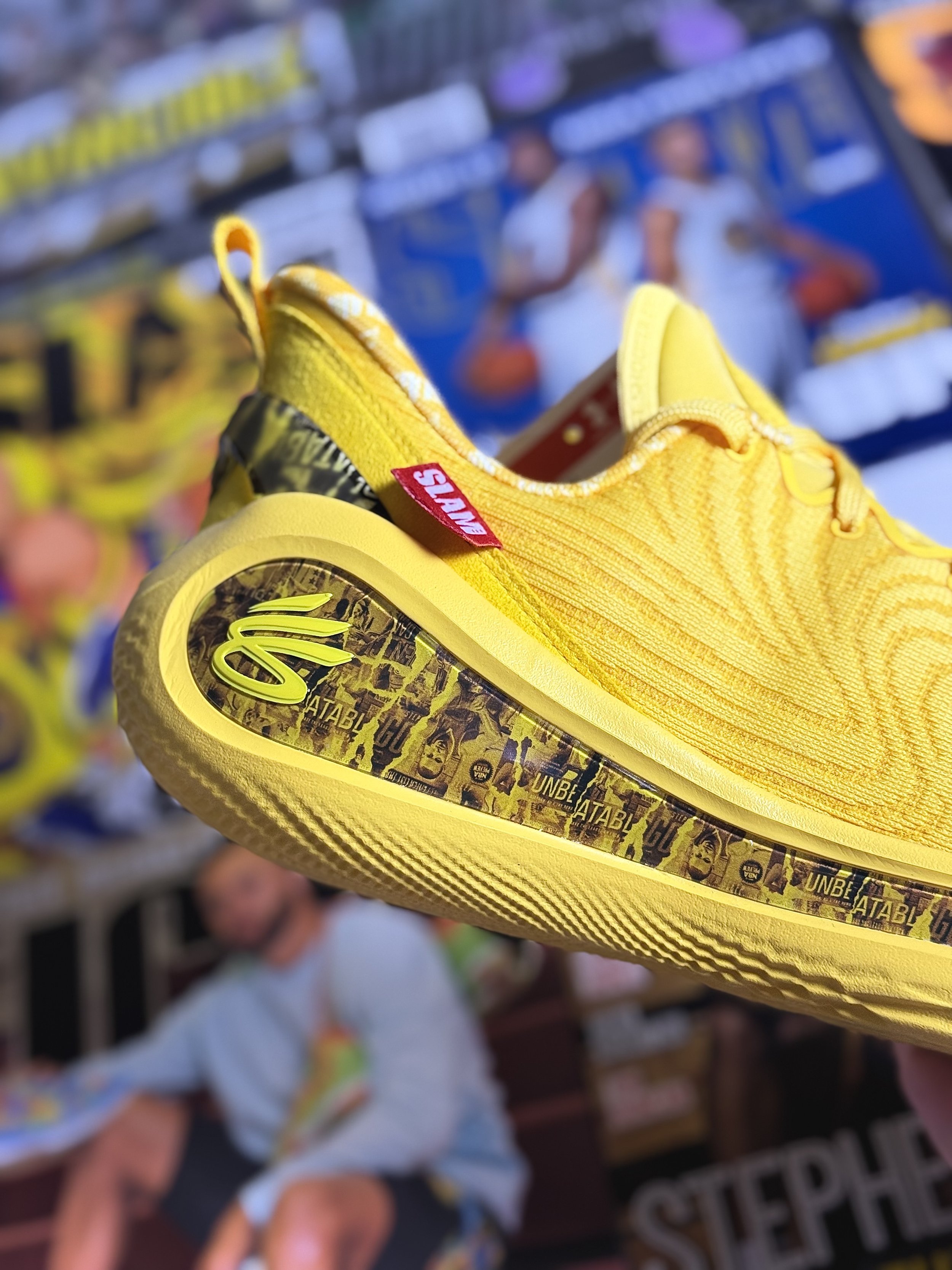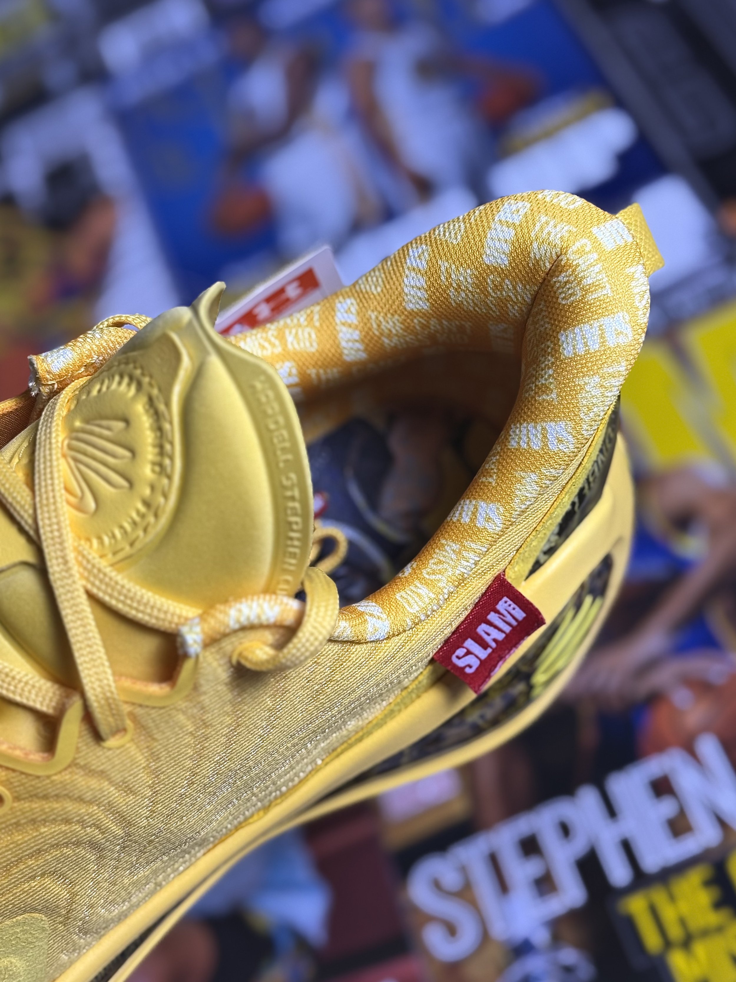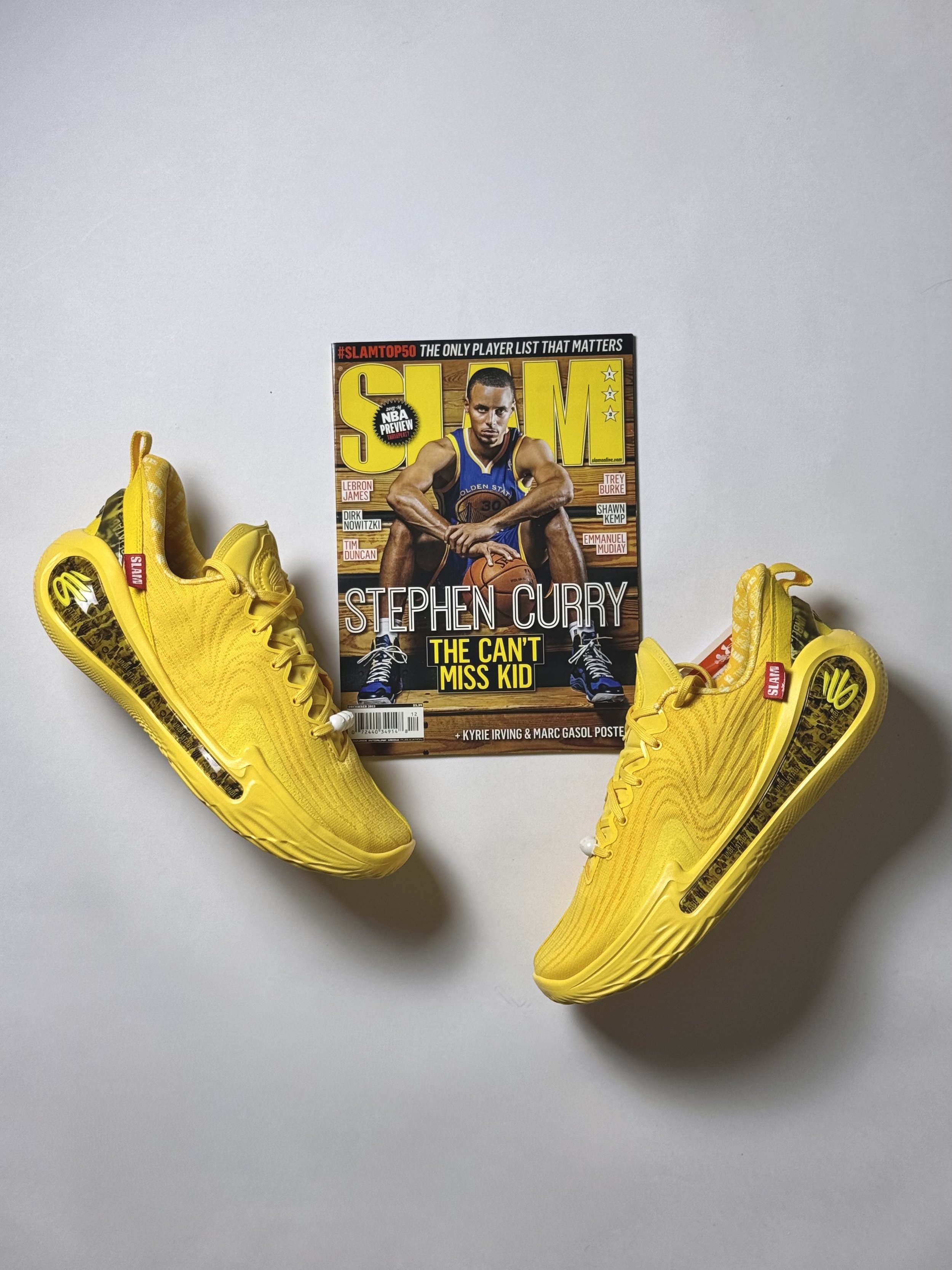This exclusive Friends and Family edition of the Curry 12, limited to only 30 numbered pairs worldwide, pays homage to Curry’s first SLAM cover—Issue #173 from December 2013—where he was dubbed “The Can’t Miss Kid.” The shoe’s all-yellow colorway draws direct inspiration from the bold block lettering of the SLAM masthead prominently featured on the cover. Adding to the narrative, the outer midsoles feature graphics of every SLAM cover on which Curry has appeared: the left shoe presents the covers with a torn-from-the-magazine effect, while the right shoe displays a cleaner, more refined visual treatment.